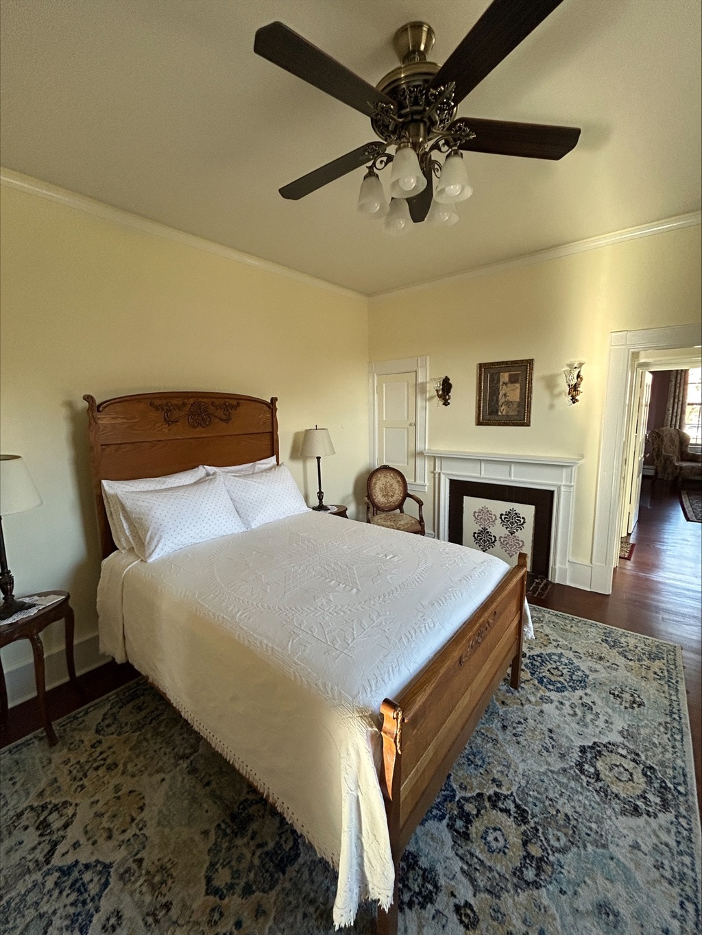 The Charming 1st Floor Historic Room offers one queen bed in a cozy bedroom off the kitchen and dining room, with no stairs required. The private, detached bathroom with a walk-in shower and bench seating is conveniently located on the first floor. There is also a shared powder room nearby for night-time convenience.