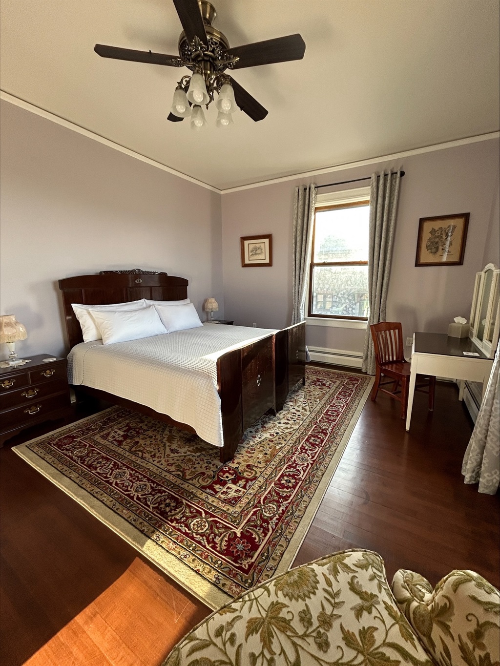 The beautiful Cherry Malt Suite includes two bedrooms sharing a bathroom with a tub shower combination and pedestal sink. The Cherry Malt Room has a king-size bed, bespoke closets, and spacious windows overlooking the National Park and the backyard. Antique furnishings complete the room's charm. The attached bathroom is shared with the Sunshine Room. The Sunshine Room features a queen bed and adjacent bathroom access. Located on the second floor, accessible by stairs.